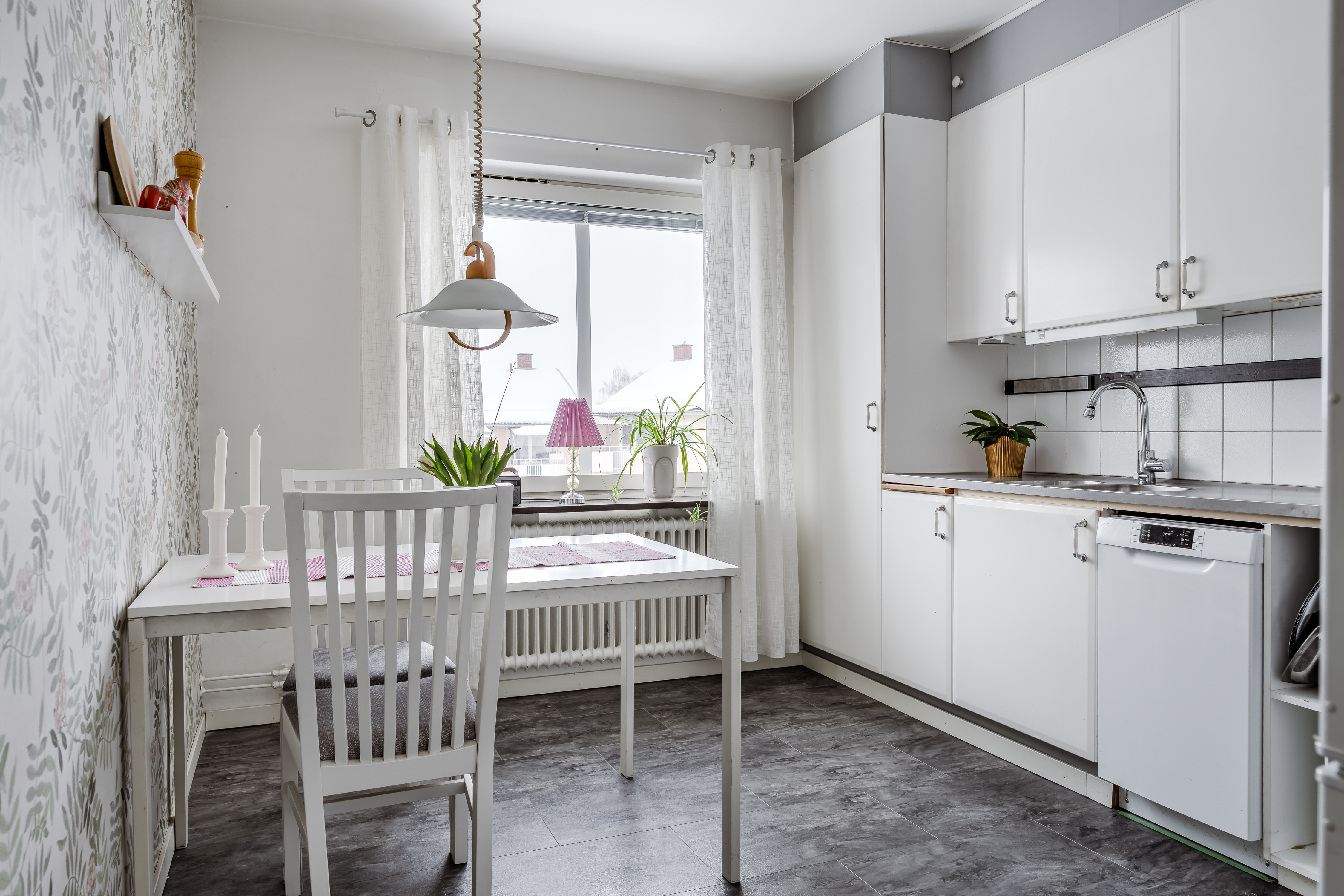 Kök med laminatgolv. Utrustat med kyl/frys, spis, fläkt och diskmaskin.