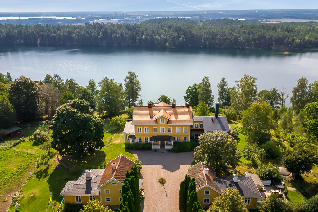 Gårdsbilden är vackert sammanhållen, omgiven av en fantastisk naturbild. Från huvudbyggnadens spektakulära sällskapsrum öppnar gården upp sig mot den angränsande sjön, vilket ger en mycket vacker vy från veranda, trädgård och balkong. Sjön Skiren är uppskattad för sitt klara vatten och goda vattenkvalitet. Intill strandlinjen har fastigheten tillgång till sjöbod med sällskapsrum och öppen spis samt vedeldad bastu med egen brygga.