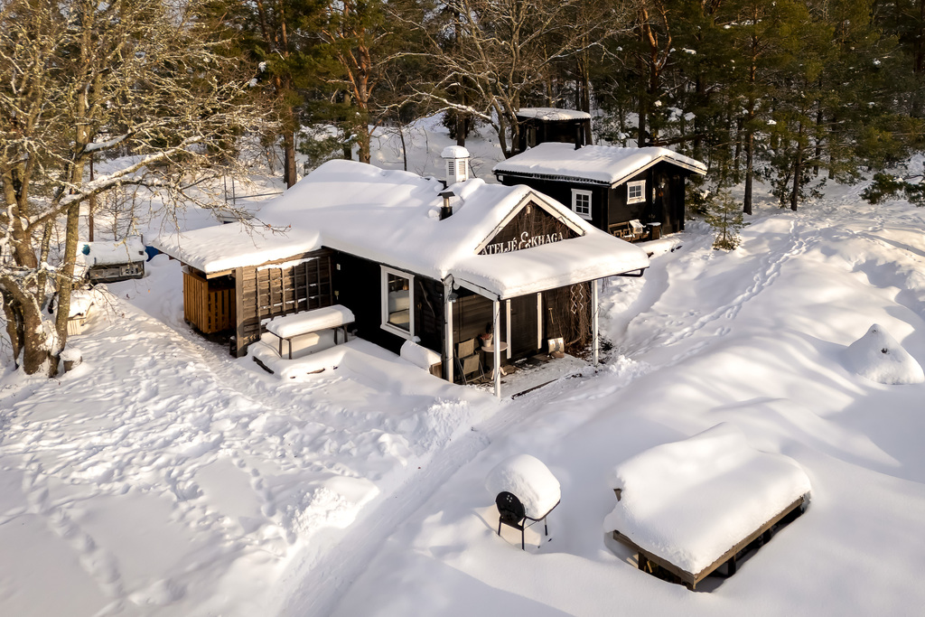 Där en gång det gamla hönshuset stod finns nu ateljén som innefattar ännu en gästbostad. Huset har renoverats 2023/2024 med nya ytskikt och nytt kök 2024. Främre delen av huset har wc, järnkamin och sovloft och kan nyttjas som gästhus, kvalitativt kontor eller för uthyrning. I bakre delen finns det nya köket monterat tidigare i år.