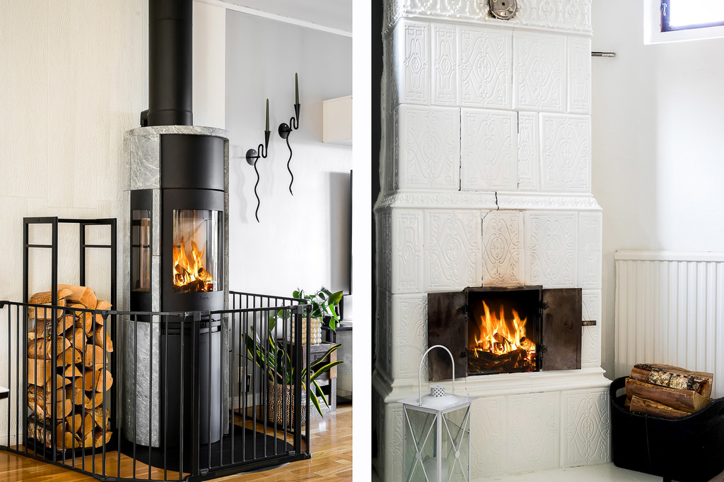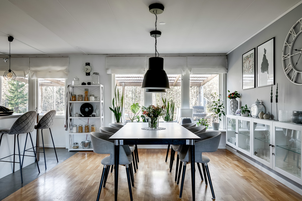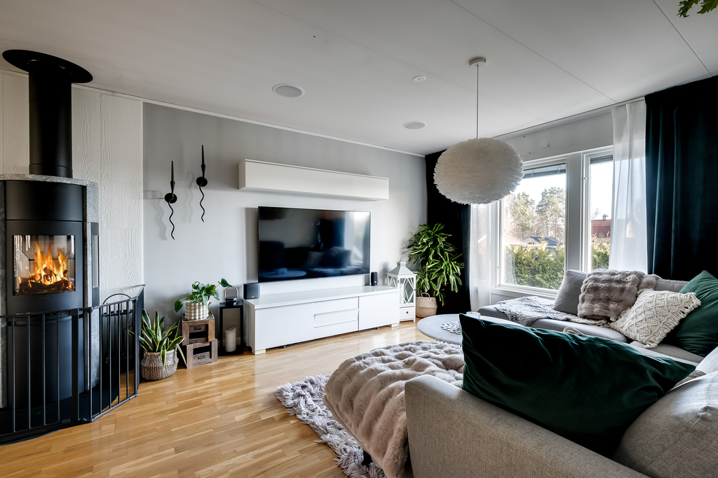 Ljust och luftigt vardagsrum med öppen planlösning mot matplatsen som skapar en social och inbjudande atmosfär. Här finns gott om plats för en större soffgrupp och annan möblering. En braskamin från Contura bidrar både med värme och mysfaktor under årets kalla dagar. De målade väggarna och parkettgolvet förstärker rummets moderna och inbjudande karaktär. Ett perfekt rum för både avkoppling och umgänge.