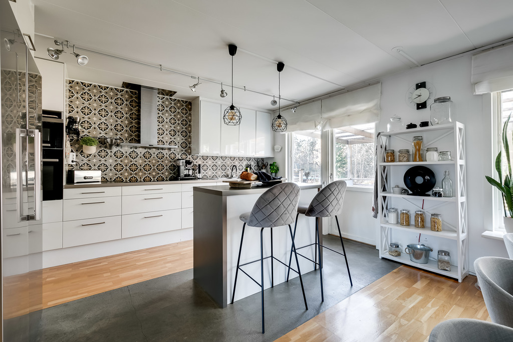 Modernt kök med vita skåpsluckor och en laminatbänkskiva som förenar funktion och design. Kökets utrustning inkluderar kyl och frys, inbyggd mikro och ugn, spishäll, köksfläkt, diskho och diskmaskin. En köksö ger extra förvaring och erbjuder plats för två sittande. Här finns även en matplats som är idealisk för både vardagsmiddagar och festligare tillfällen. Golvet är delvis parkett och delvis betong, vilket skapar en unik och stilfull kontrast.