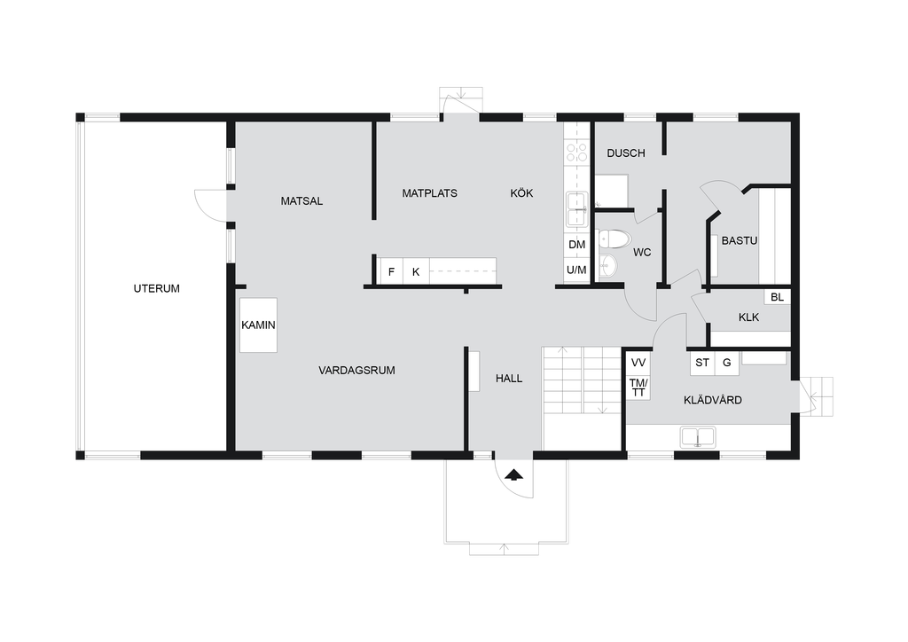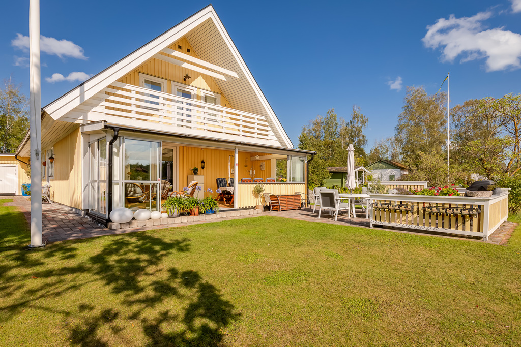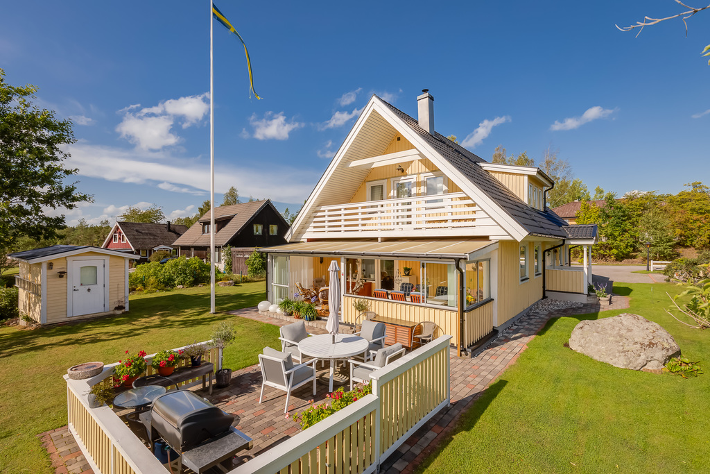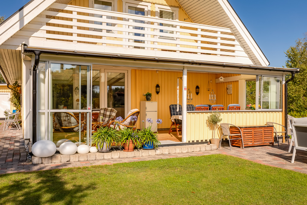 Den stora trädgården är en stor tillgång för huset, med gott om plats för lek, odling och avkoppling. Det rymliga inglasade uterummet blir en självklar samlingsplats från tidig vår till sen höst och förlänger både sommarsäsongen och utelivet.