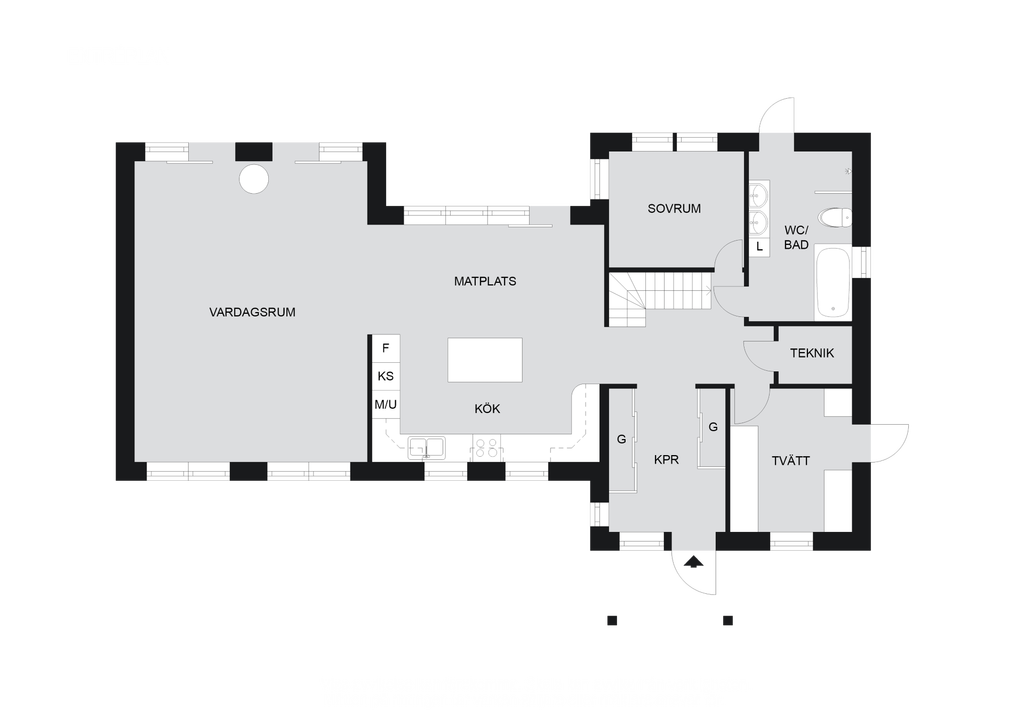 Entrén med dubbeldörrar välkomnar med två stora garderober med skjutdörrar i spegelglas som ger rymd och funktion, och ett fönster som släpper in naturligt ljus. Väggarna är målade och det slipade betonggolvet ger en modern känsla. Från hallen tar trappan dig vidare upp till husets övre plan.
