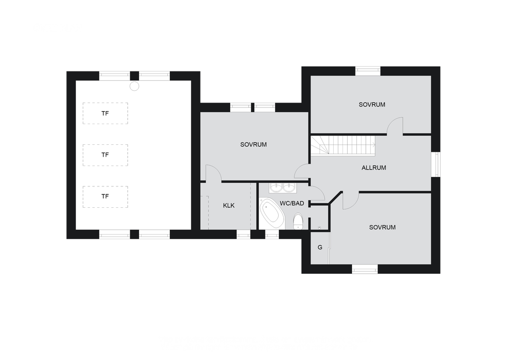 Övre plan erbjuder välplanerade sovrum och ett allrum för avkoppling, där master bedroom utmärker sig med egen klädkammare och sober färgsättning. Planlösningen ger både privata utrymmen och sociala ytor i en perfekt balans.