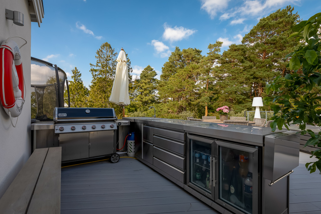 Köket från Vedum är hjärtat av hemmet – en stilren och social plats med köksö, generösa arbetsytor och full utrustat. Skjutdörrarna i glas öppnar upp mot altanen mot poolen och bubbelpoolen och gör köket till en naturlig del av utemiljön.