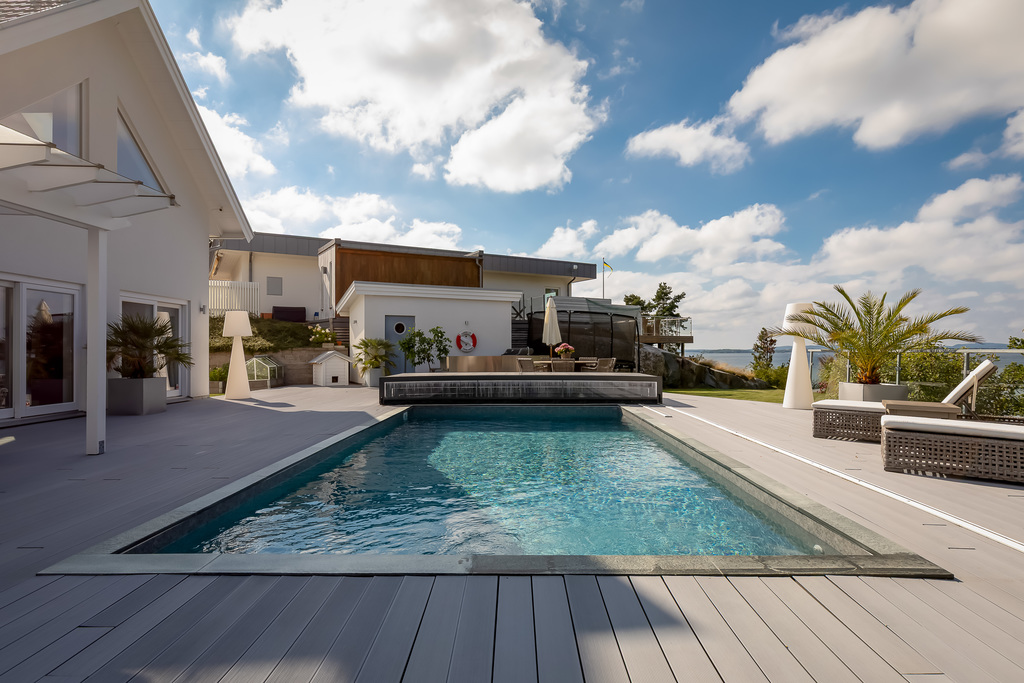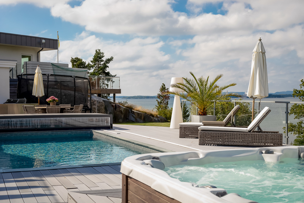 Utomhusmiljön är något utöver det vanliga. Den stora altanen i komposit ramas in av pool, bubbelpool och en välskött trädgård – allt med en vidsträckt och hänförande vy över Bråviken. Här upplevs en unik kombination av avskildhet, lyx och natur som sällan kommer ut på marknaden.