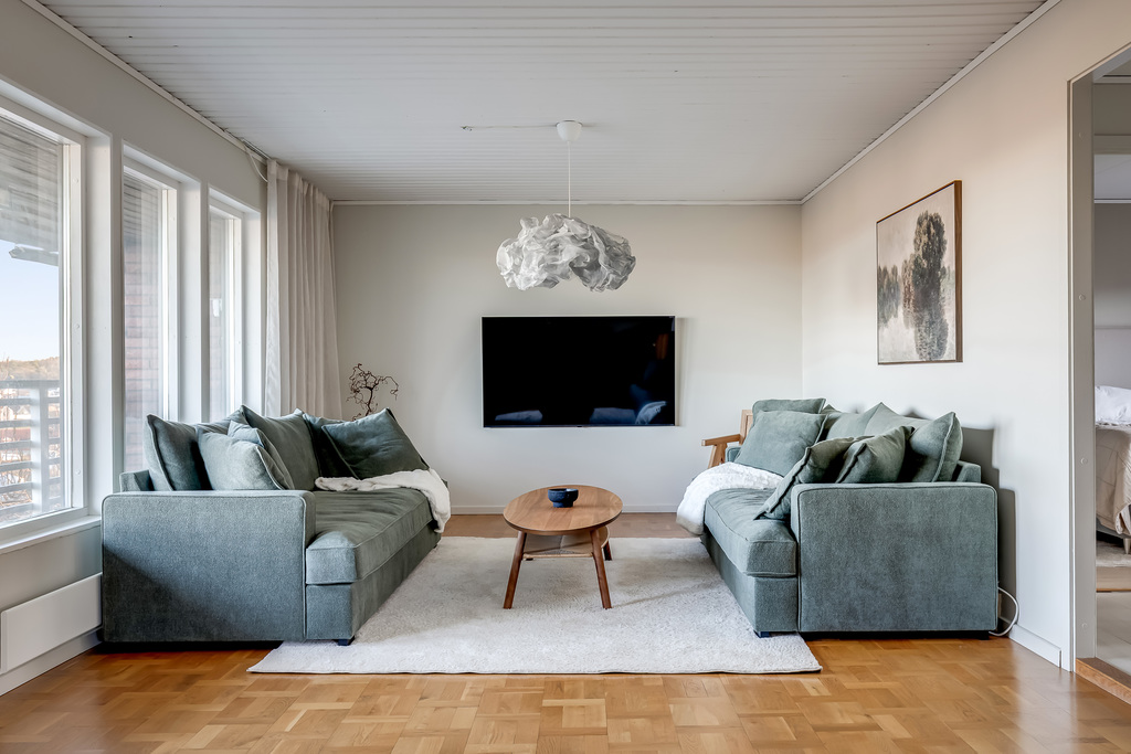 Vardagsrummet bjuder på en ljus och trivsam atmosfär med parkettgolv och greigemålade väggar. De tre stora fönsterpartierna ger ett härligt ljusinsläpp och rummet har utgång till en balkong med utsikt över omgivningen – en naturlig plats för umgänge och avkoppling.