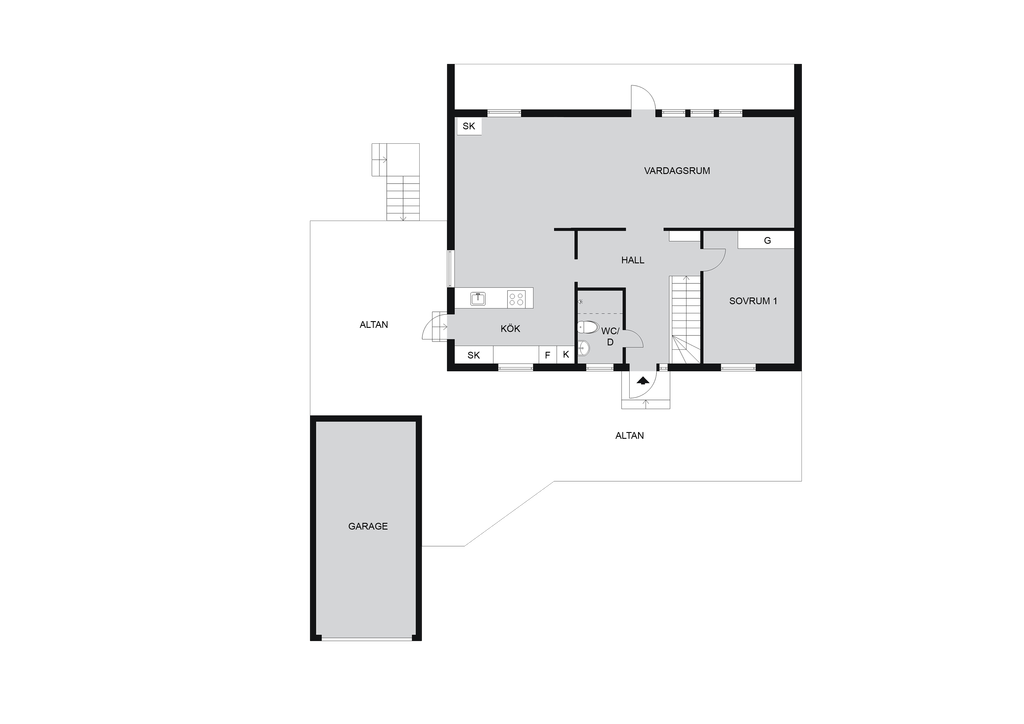 Köket är både funktionellt och socialt, med klinkergolv, målade väggar och gott om förvaring. Det stilrena köket från KVIK har en stor köksö med massiv träskiva som skapar en naturlig samlingspunkt. Maskinell utrustning består av induktionshäll, fläkt i rostfritt, kyl och frys i rostfritt samt ugn. Från köket nås en altan med soligt läge och utsikt mot framsidan – perfekt för morgonkaffet eller middagar utomhus.