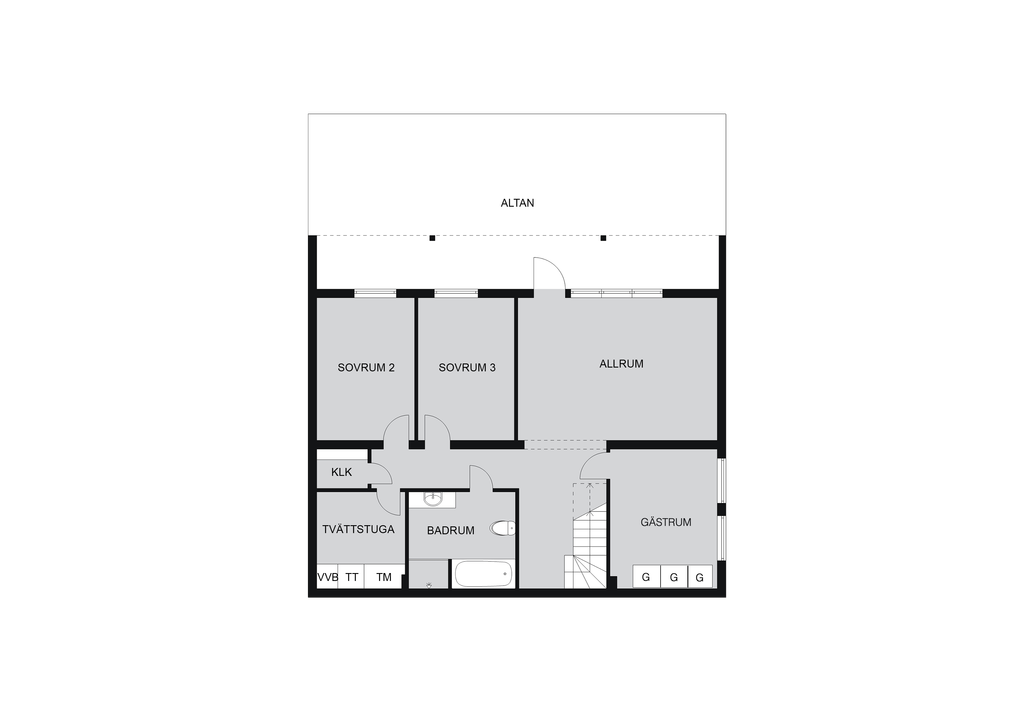Det nedre planet bjuder på ett generöst och ljust allrum med plats för större soffgrupp. Här är det målade väggar, det ligger laminatgolv, målade väggar och tre stora fönster som ger ett härligt ljusinsläpp. Här finns även utgång till altandäck och trädgård – en naturlig förlängning av bostadens sociala ytor. På detta plan finns även ytterligare flera sovrum i bra storlekar. Alla har enhetligt och snyggt samma golv som löper genom hela våningsplanet.