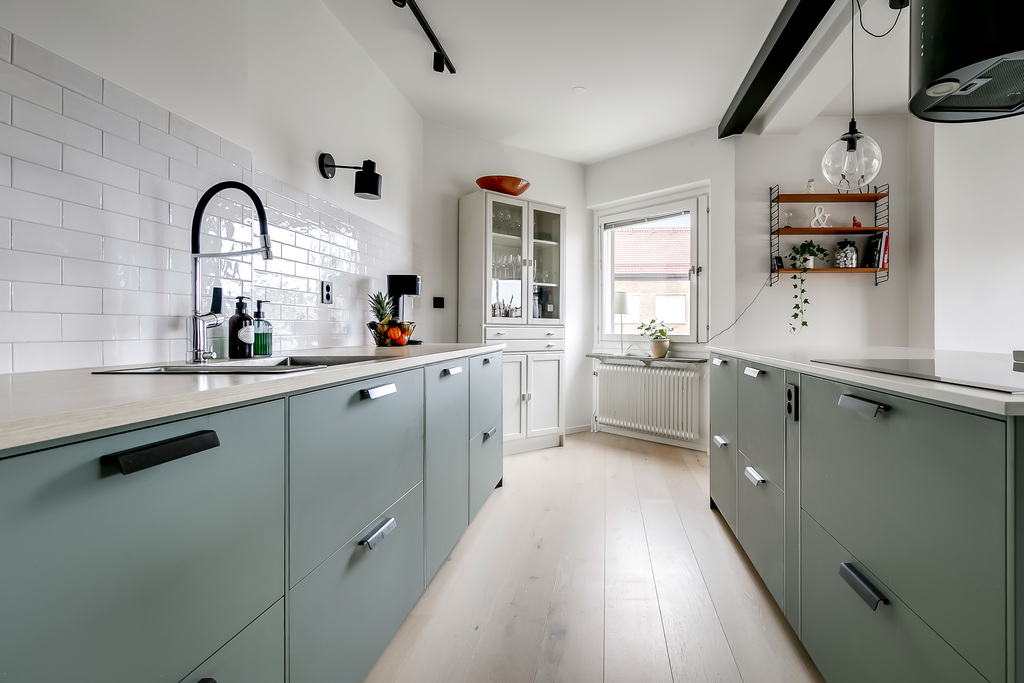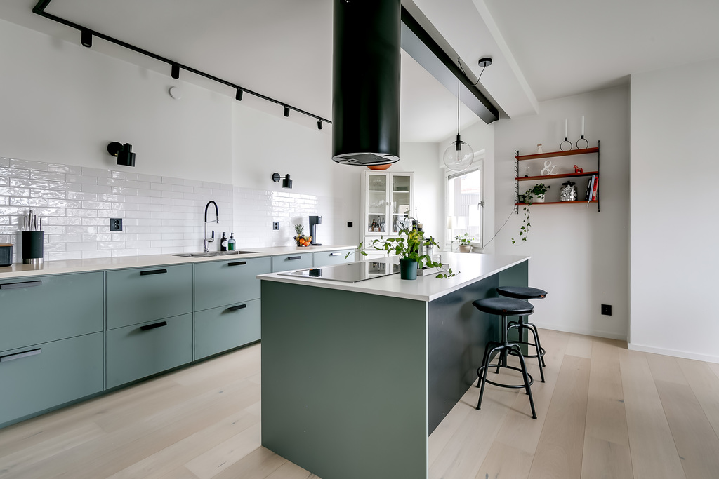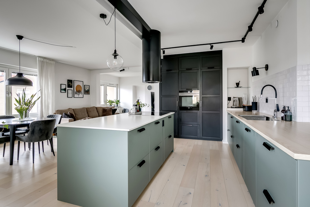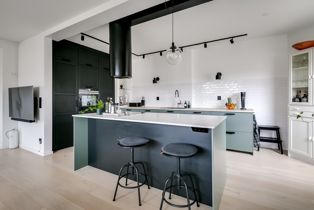 Från hallen leds du vidare in i det moderna köket med minimalistiskt uttryck och generösa arbetsytor. Den stora köksön skapar både extra arbetsyta och en naturlig samlingspunkt. Köket är öppet mot vardagsrummet, vilket ger en social och sammanhängande planlösning.