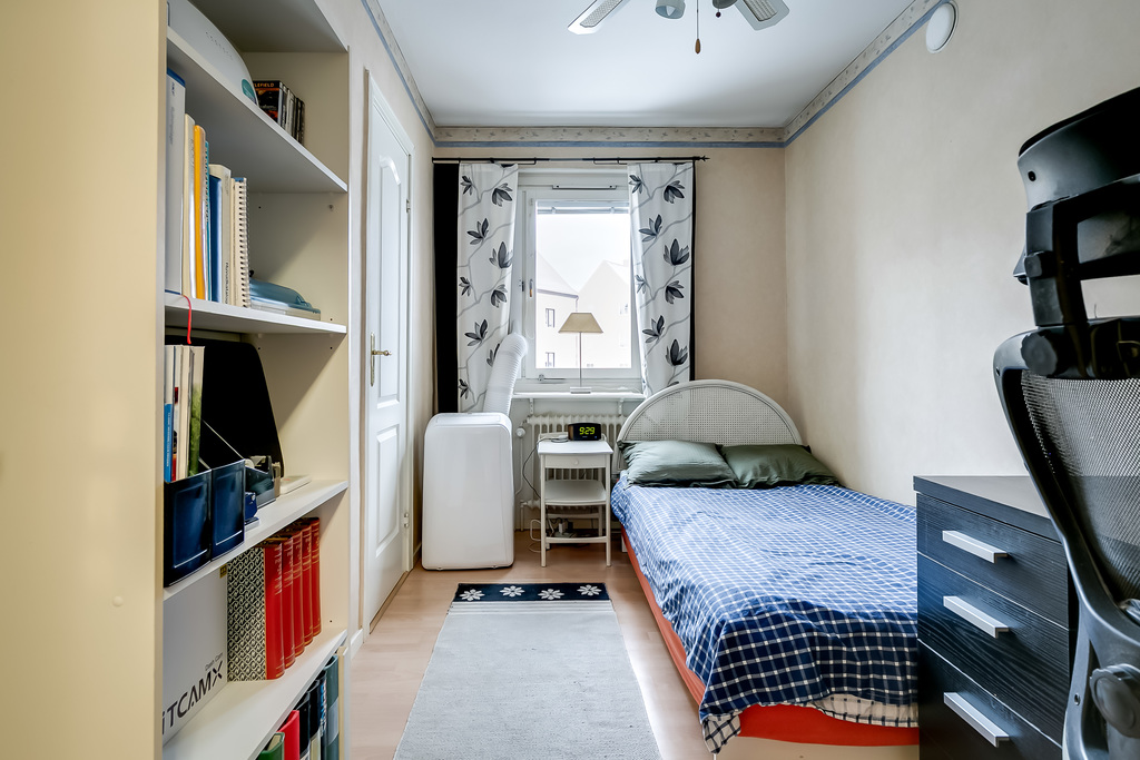 Det mindre sovrummet har, liksom det större, fönster mot entrésidan och passar utmärkt som barnrum, gästrum eller hemmakontor. Här finns även en egen klädkammare som bidrar till ett välorganiserat boende.