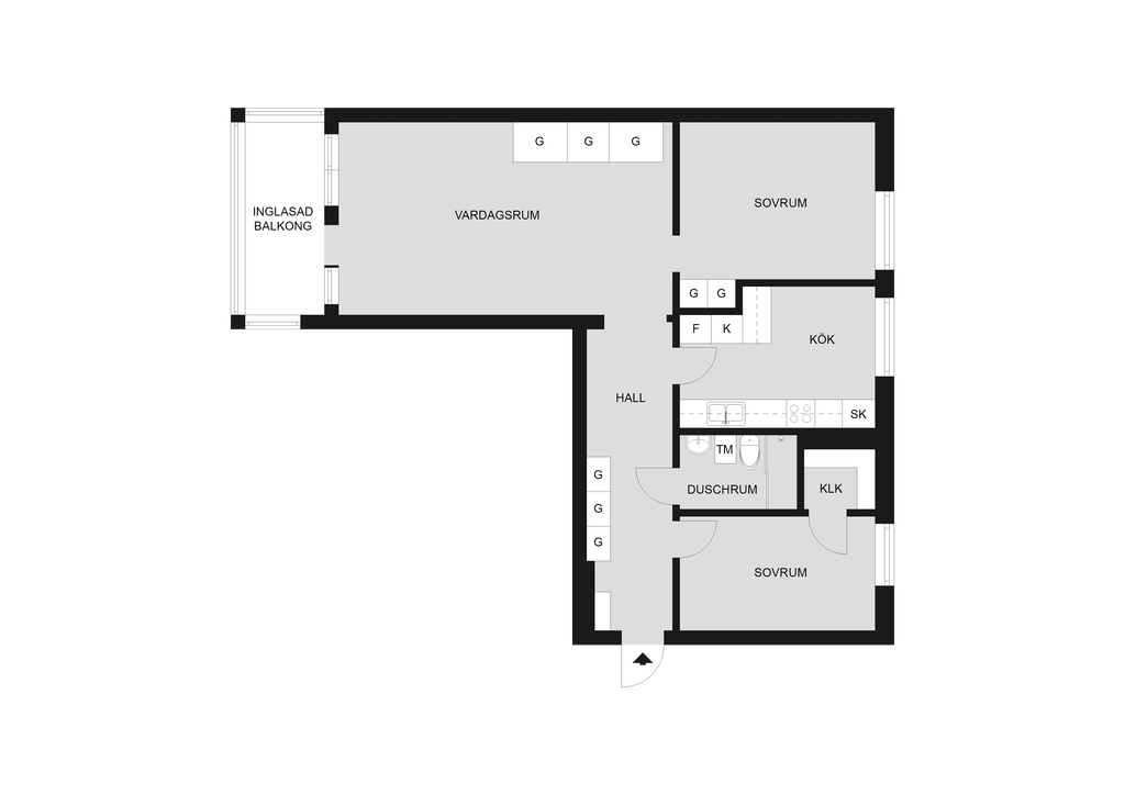 Vardagsrummet bjuder på en klassisk och tidlös känsla med vacker fiskbensparkett. Härifrån nås den inglasade balkongen som förlänger rummet och skapar en härlig plats att nyttja stora delar av året. Förvaringen är generös med två dubbelgarderober samt en enkelgarderob – perfekt för dig som uppskattar smarta förvaringslösningar.