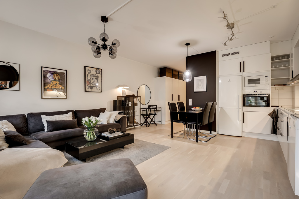 Bostaden erbjuder en modern och öppen planlösning mellan kök och vardagsrum som skapar en social och luftig atmosfär. Här finns gott om plats för både soffa och matbord, vilket gör ytan perfekt för såväl vardagsliv som umgänge. Det fullt utrustade köket är stilrent och funktionellt med generösa arbetsytor och bra förvaring.