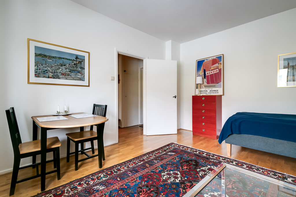 Allrummet har parkettgolv som ger en varm och trivsam känsla. Väggarna är målade i ljusa toner vilket tillsammans med golvet skapar ett ljust och lättmöblerat rum.