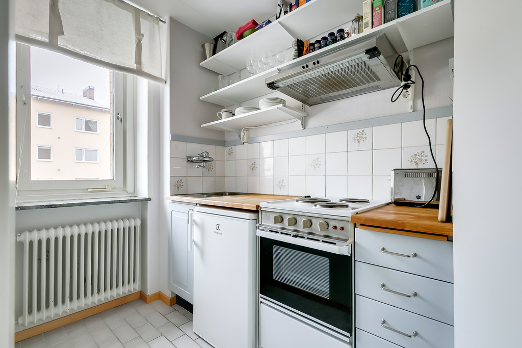 Köket har klinkergolv som är både slitstarkt och lättskött. Väggarna är ljusa och bidrar till ett fräscht och funktionellt intryck.