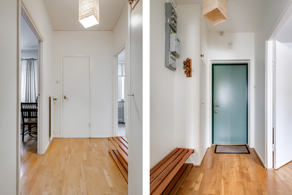 Hallen är försedd med parkettgolv och ljusa väggar, vilket ger en enhetlig känsla mot bostadens övriga rum.