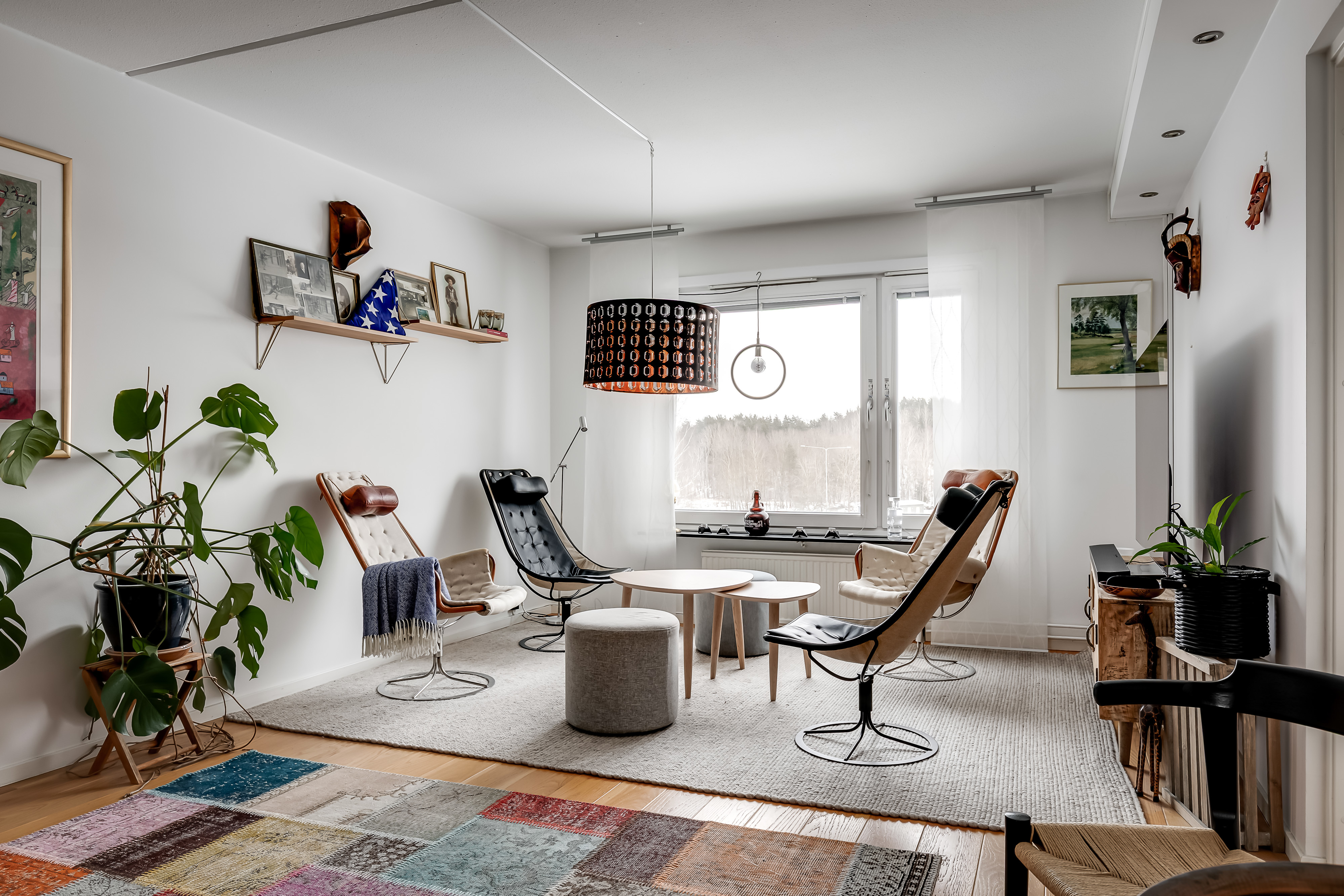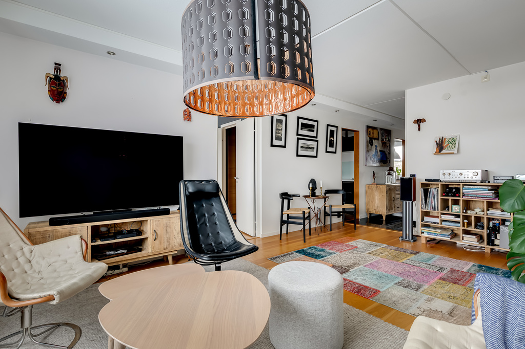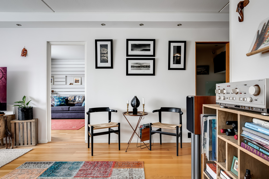 Ljust och harmoniskt vardagsrum med stora fönsterpartier och utsikt över innergården. Rummet rymmer både soffgrupp och kompletterande möblering. Ljusa väggar och parkettgolv skapar en tidlös bas.