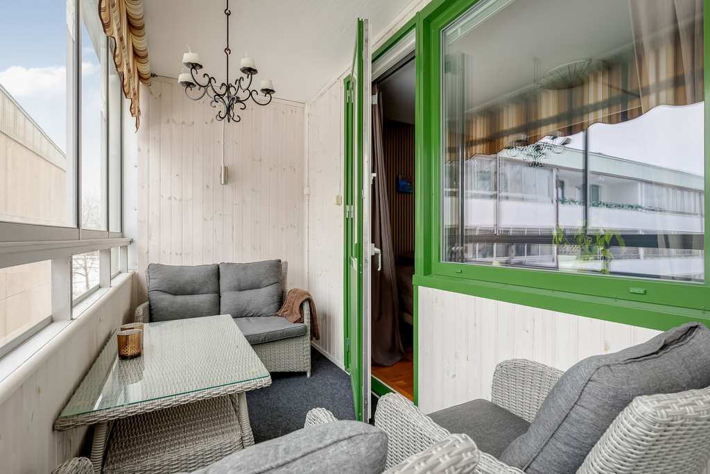 Vardagsrummet erbjuder gott om plats för både soffgrupp och kompletterande möblering, och den inglasade balkongen fungerar som ett extra rum stora delar av året – perfekt för morgonkaffet, middagar i kvällssolen eller en lugn stund oavsett säsong. Bostadens kanske främsta mervärde är just den generösa inglasade balkongen som nås från två olika rum. Balkongen är uppdelad i två sektioner med skjutbara glaspartier.