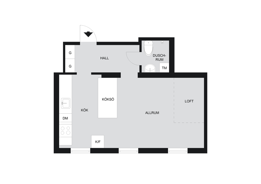 Köket är stilrent och praktiskt utformat med en köksö och överhängande skiva som skapar en naturlig matplats samtidigt som den ger en fin avgränsning mot allrummet. Sällskapsdelen rymmer både soffhörna och en mysig TV-plats, och det smarta loftet frigör golvyta och ger en avskild sovplats. Duschrummet är kaklat på väggarna och utrustat med egen tvättmaskin för extra vardagskomfort. I hallen finns inbyggda garderober som erbjuder bra förvaring direkt när du kliver in.