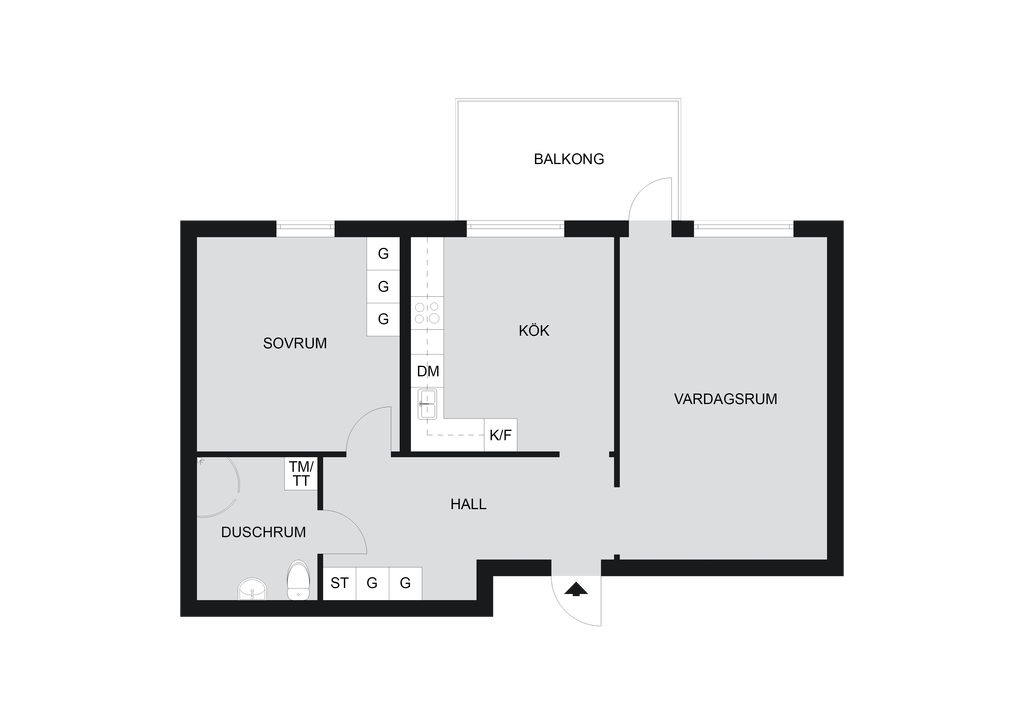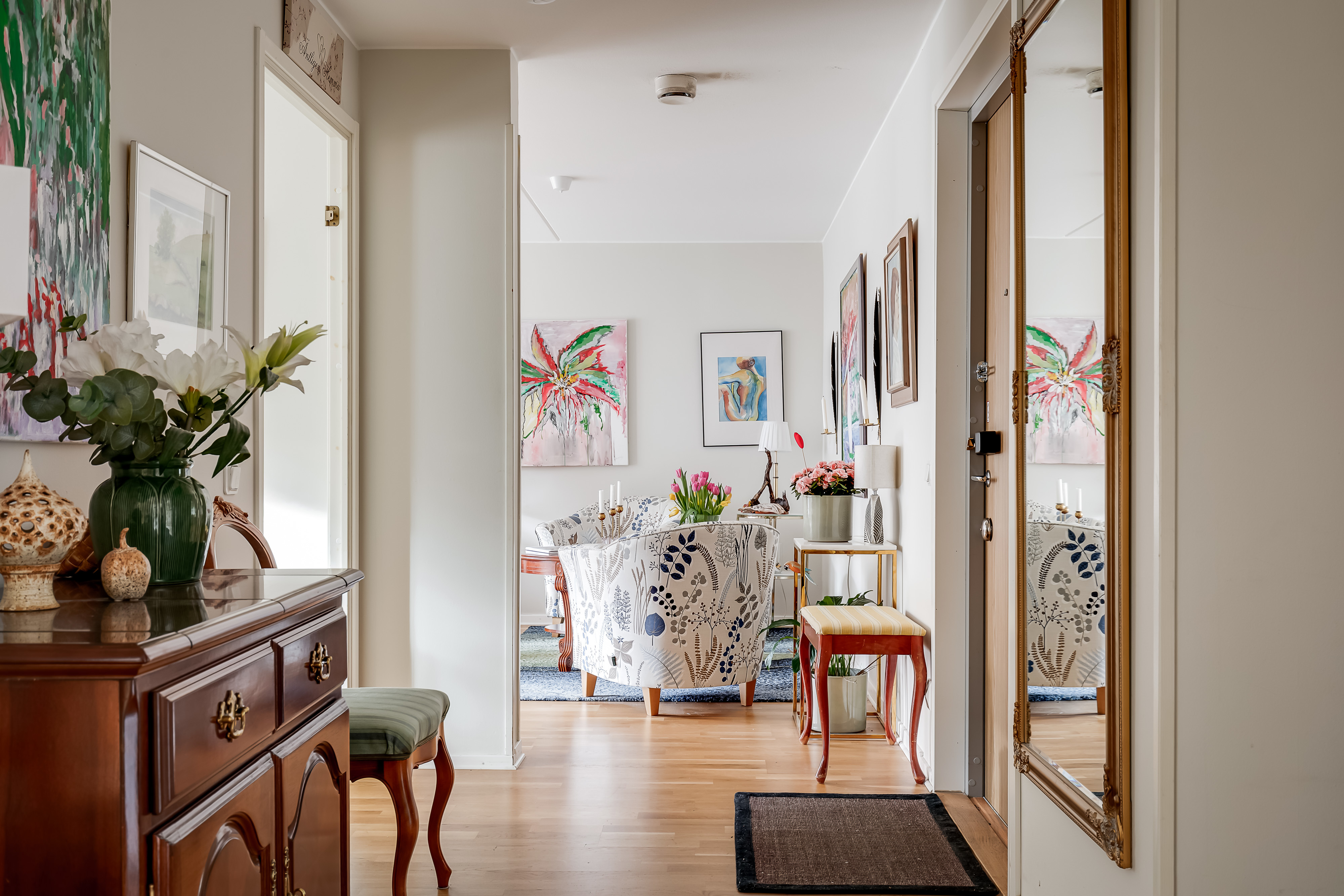 Innanför ytterdörren möts vi av en hall som är välkomnande och rymlig och som delvis kan möbleras, exempelvis med en liten sittplats eller avlastningsmöbel. Här finns tre garderober samt gott om plats för avhängning, vilket ger praktisk förvaring direkt när du kliver in i bostaden. I hallen, liksom genomgående för hela lägenheten utom i duschrummet, är det snyggt ekparkettgolv. Alla innerdörrar är moderna vita spegeldörrar.