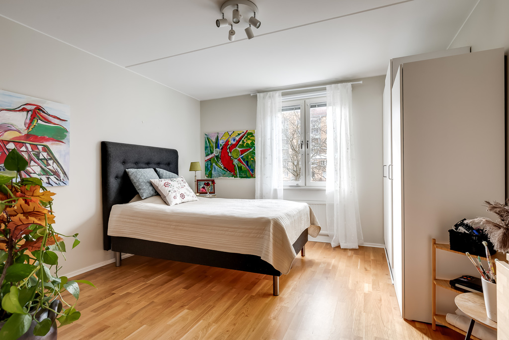Rofyllt i och med fönster mot den lugna gården. Här finns gott om plats för dubbelsäng samt bra förvaring i både en enkel garderob och en rymlig dubbelgarderob.