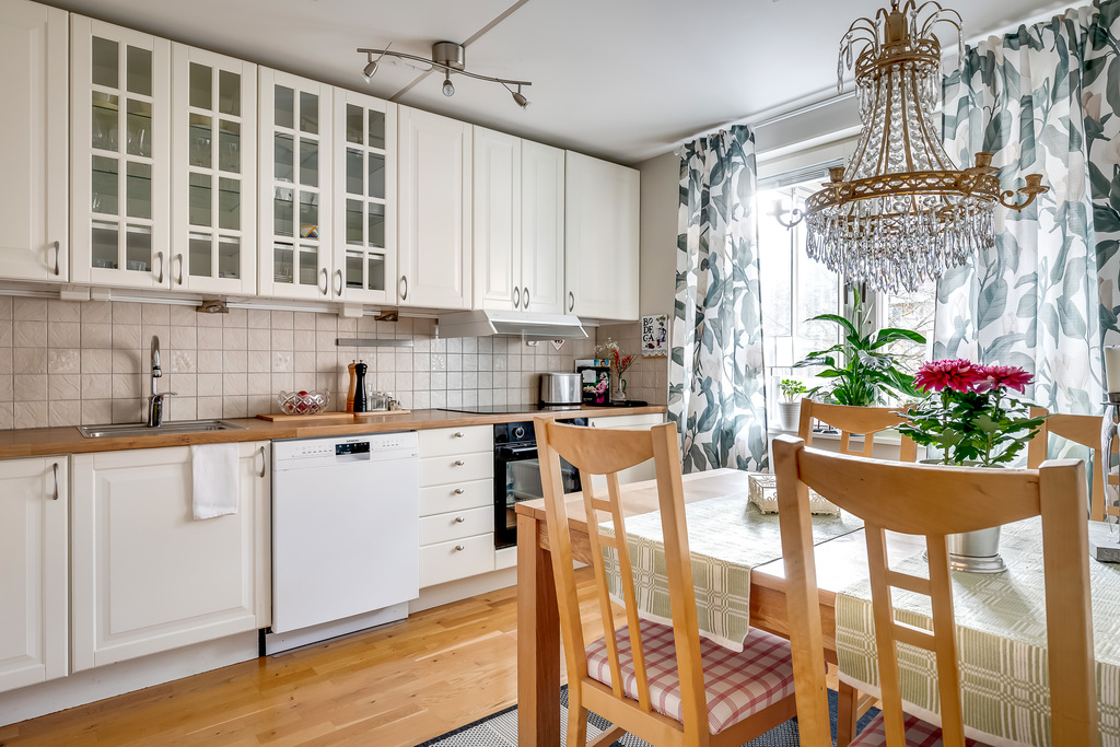 Rymligt och trivsamt med plats för matbord vid fönstret – en naturlig samlingspunkt i hemmet. Den ljusa köksinredningen har två charmiga vitrinskåp som ger både karaktär och extra förvaring. Köksbänken i trä är från 2024 och har en nedsänkt diskho. Köket är utrustat med kyl/frys, diskmaskin, en hällspis (2026) med ugn samt en fristående mikrovågsugn.
