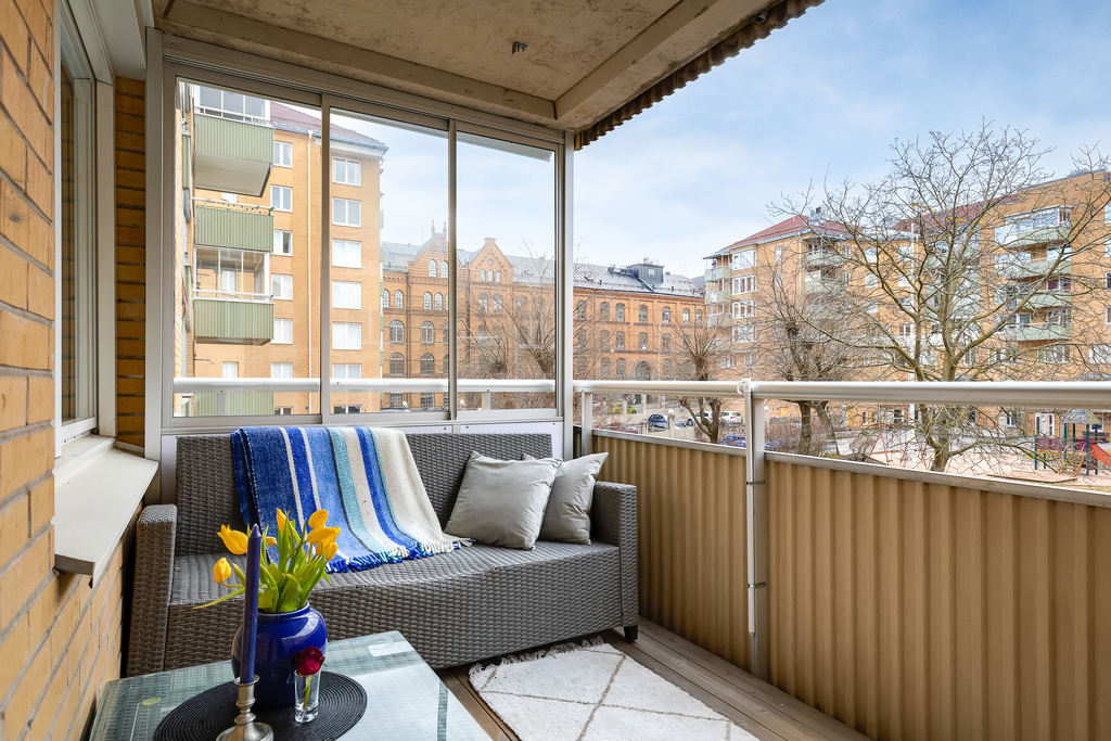Balkongen har ett soligt sydvästläge med utsikt mot den lugna och trevliga innergården. Här kan du njuta av eftermiddags- och kvällssolen i en avkopplande miljö. En glasvägg på ena sidan ger både vindskydd och en ombonad känsla.