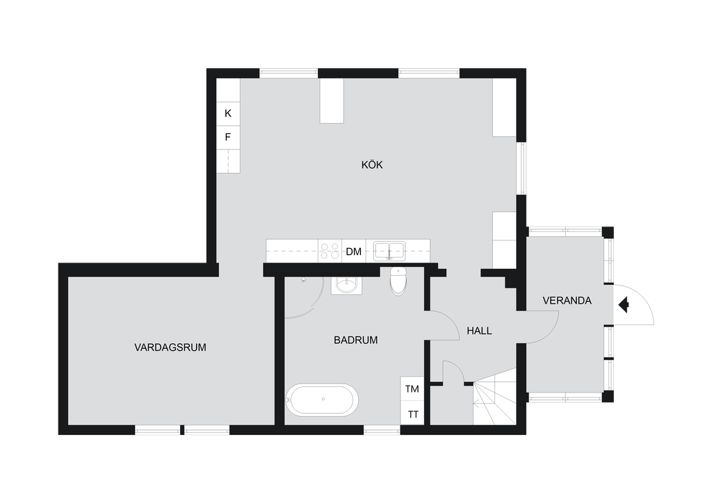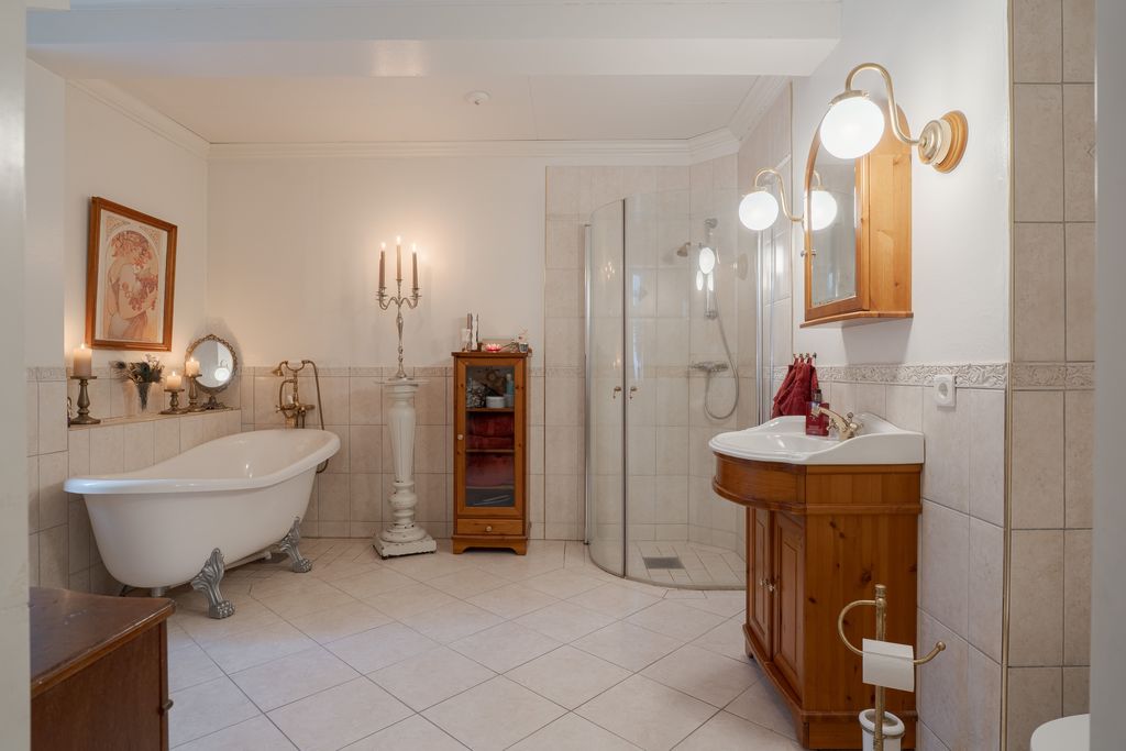 Entréplanet bjuder på en välkomnande hall som leder vidare till ett stort badrum renoverat 2009 med dusch, badkar, tvättmaskin och gott om förvaring. Köket som renoverades 2009 är rymligt och charmigt med plats för ett rejält långbord. En naturlig samlingspunkt för familj och vänner. Intill köket ligger det mysiga vardagsrummet.