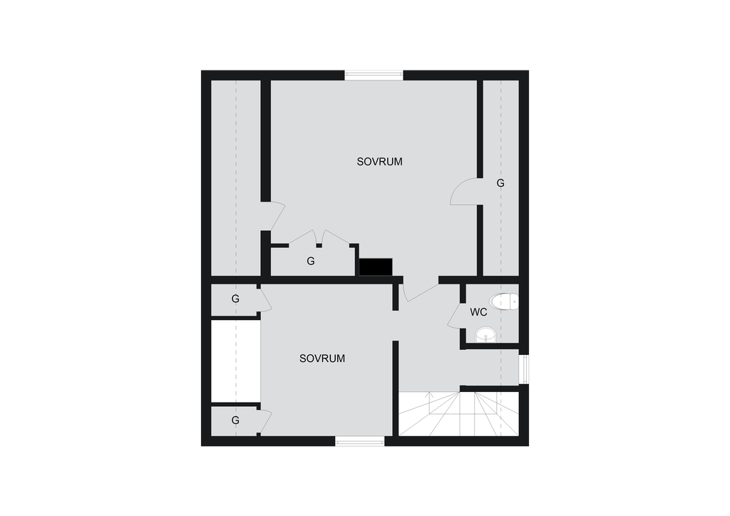 Övervåningen rymmer två rofyllda sovrum, en mindre toalett samt en praktisk kontorshörna.