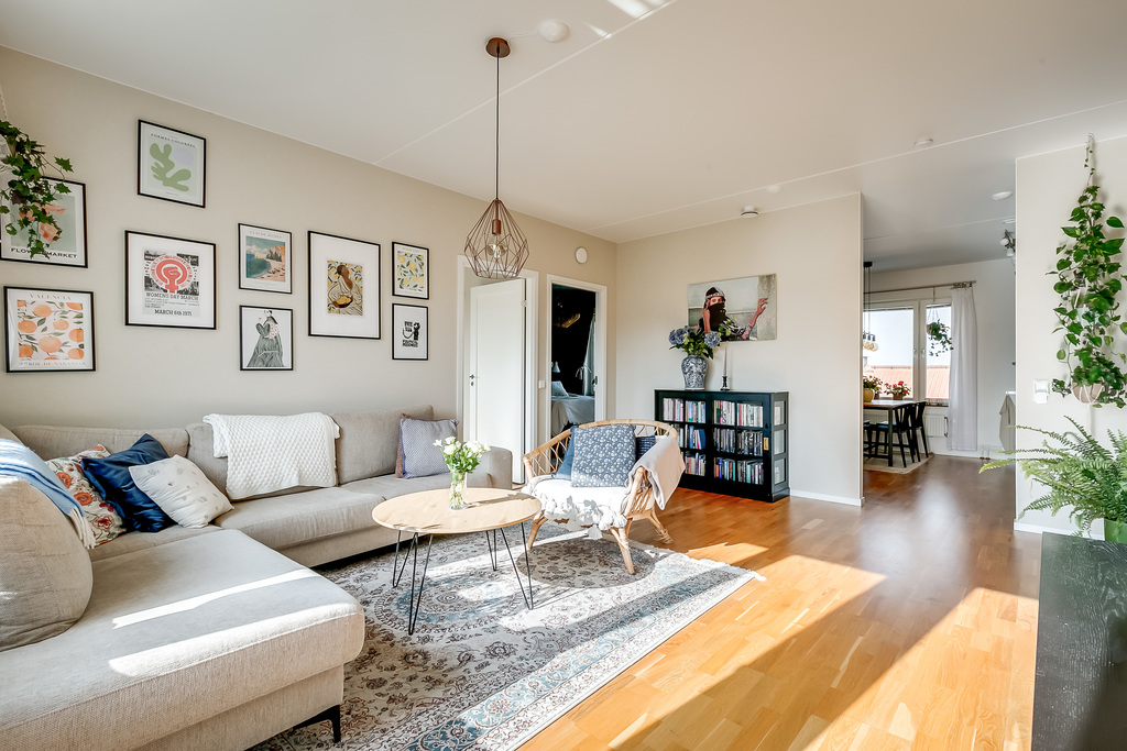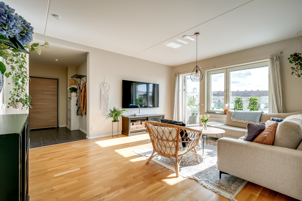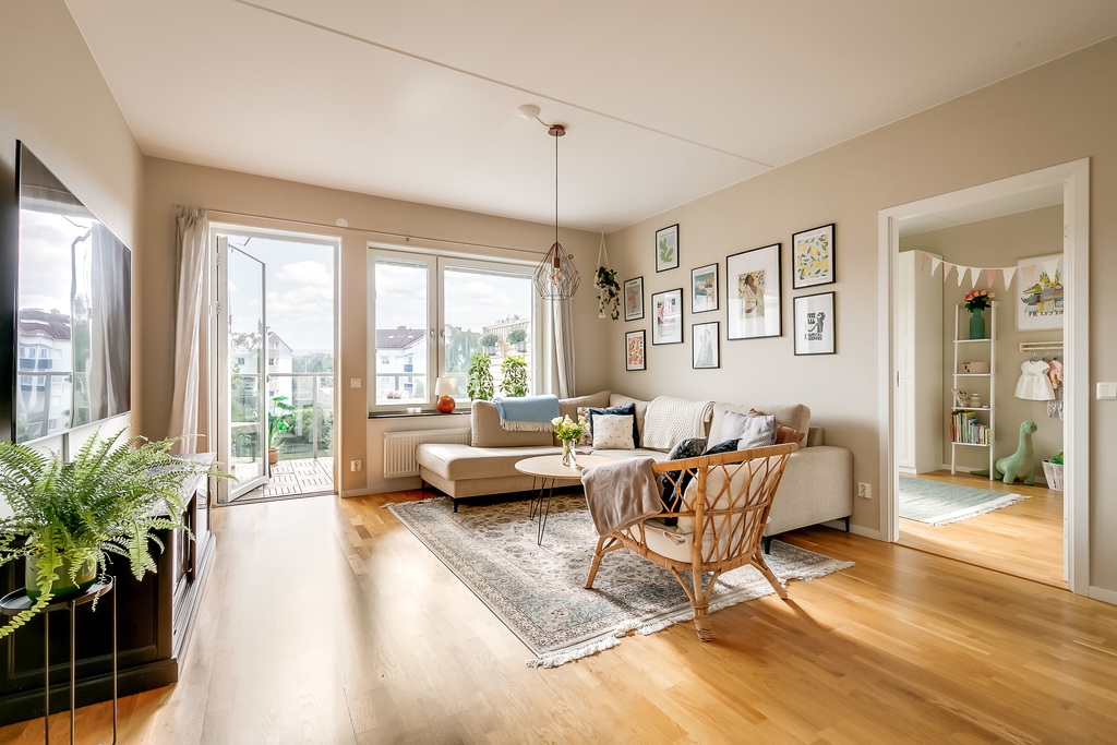 I vardagsrummet får du njuta av en öppen och social yta och stora fönster som bidrar till trevligt ljusinsläpp. Väggarna är tapetserade i en hemtrevlig beige ton och golvet är av ekparkett. Här når du även utgången mot en av bostadens balkonger, som vetter i soligt sydvästläge med utsikt över föreningens ombonade innergård.
