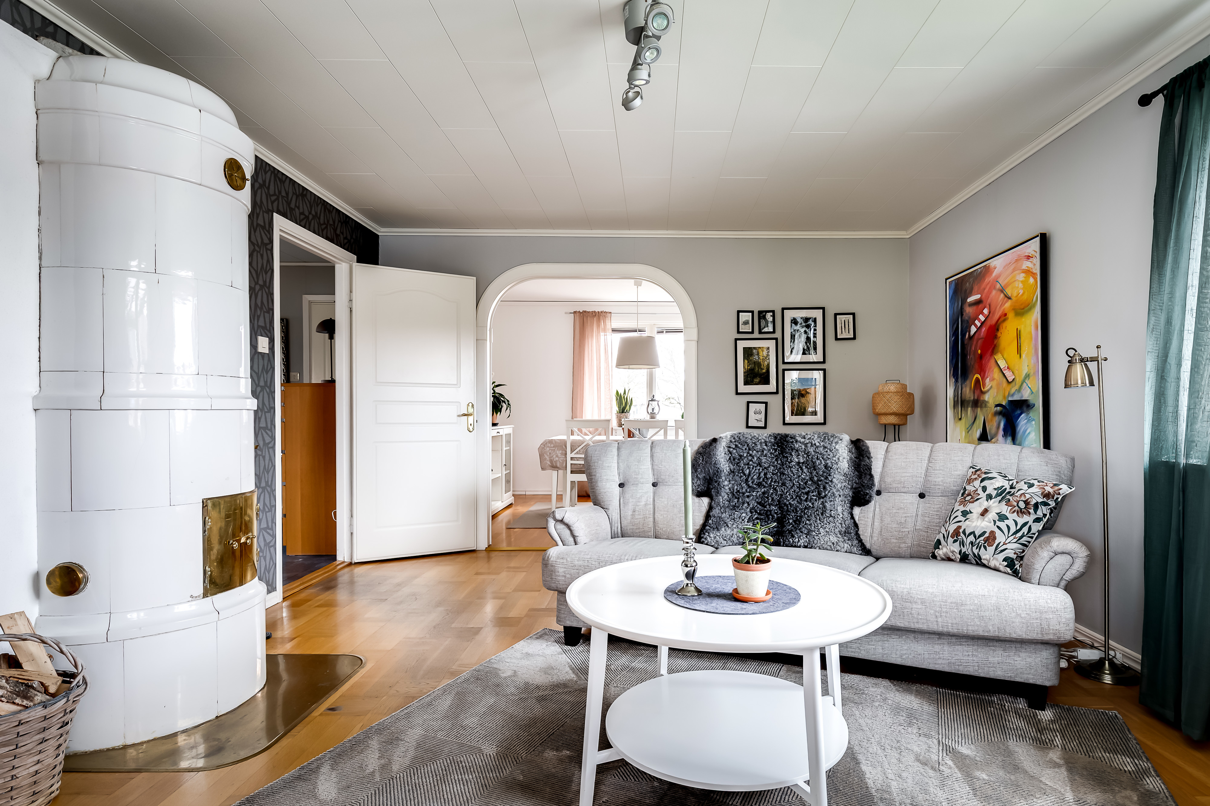 Ljust och trivsamt vardagsrum i härligt hörnläge med ekparkett på golvet och gott om plats för både soffgrupp och familjens umgänge. Den fungerande kakelugnen bidrar med både värme och charm under årets kallare månader. Härifrån nås den stora altanen under tak i soligt söderläge – en förlängning av vardagsrummet där barnen kan leka i trädgården medan de vuxna kopplar av.