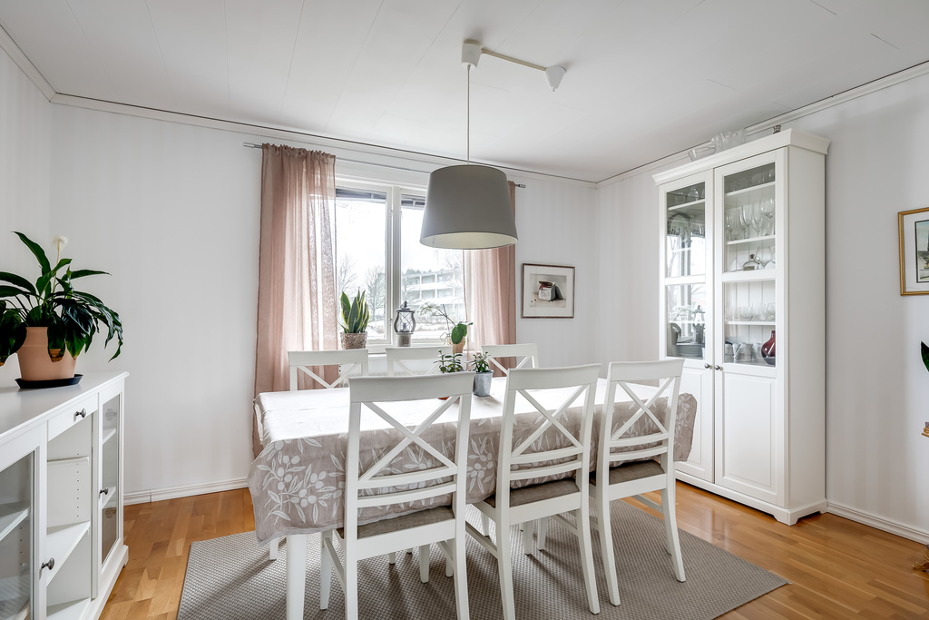 Matsalen ligger i fil med vardagsrummet och har även den ekparkett på golvet. Här finns gott om plats för större middagar, kalas och högtider. För den växande familjen kan rummet enkelt användas som extra sovrum eller lekrum vid behov.
