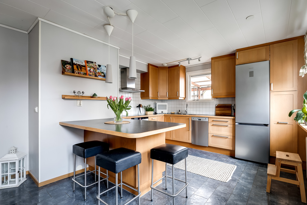 Ett arbetsvänligt och socialt kök som blir hemmets naturliga samlingspunkt. Köket byggdes om och renoverades 2012 och erbjuder gott om både bänkyta och förvaring. Köksluckorna i gedigen ek samspelar fint med de grå laminerade arbetsbänkarna med ekinslag och skapar en varm, tidlös känsla. Den generösa köksön erbjuder extra förvaring och har plats för fyra personer – en perfekt plats för frukostar, läxläsning eller när vännerna droppar in. Köket är utrustat med hällspis med varmluftsugn och fläkt, kyl/frys samt diskmaskin, vilket gör matlagningen smidig även i en aktiv familjevardag.