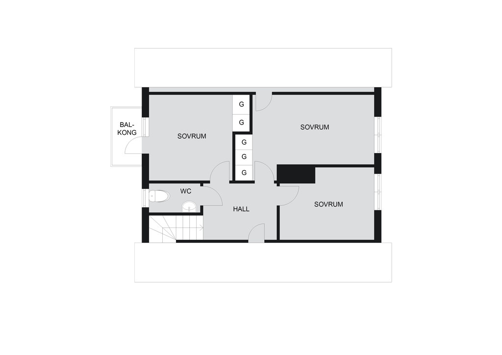 Det övre planet är husets mer privata del, perfekt för familjens sovrum. Här ligger trägolv genomgående och de charmiga snedtaken ger rummen karaktär. Vita spegelinnerdörrar förstärker den klassiska känslan.