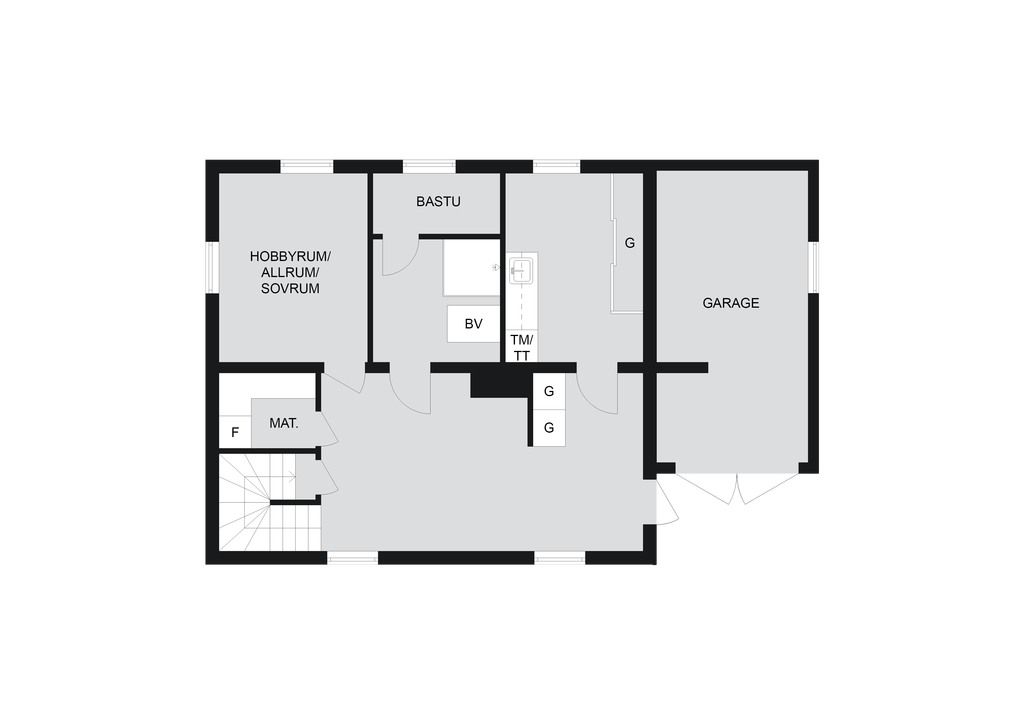 Nedanför trappan möts du av ett stort, öppet och möblerbart utrymme med klinkergolv och målade väggar. Här finns utgång till garaget, gott om förvaring under trappan samt ett matkällarförråd som även rymmer extra frys – perfekt för storfamiljen. Vid groventrén från garagenedfarten finns dessutom garderober för ytterkläder, perfekt för leriga barnstövlar och overaller.