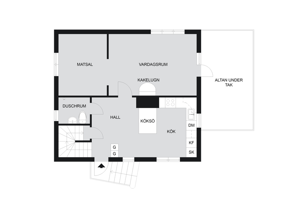 Via en trappa med skyddande tak når du entrén till detta välskötta familjehem. Innanför ytterdörren välkomnas du av en praktisk hall med slitstarkt grått laminatgolv som löper vidare in i köket – perfekt för barnfamiljens vardag med blöta skor och ytterkläder.