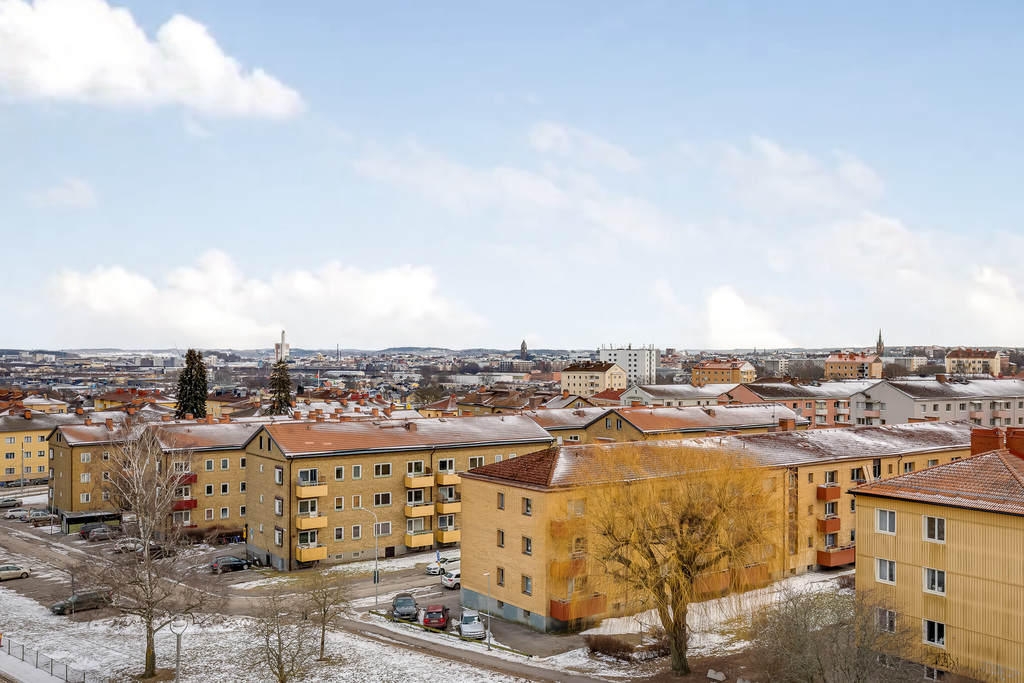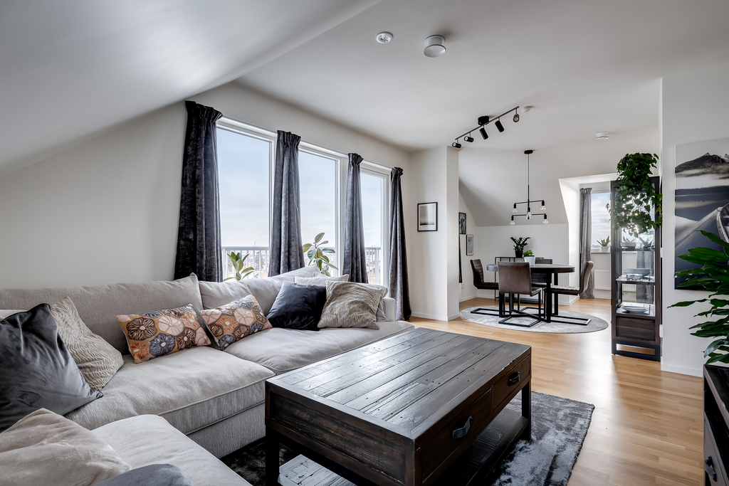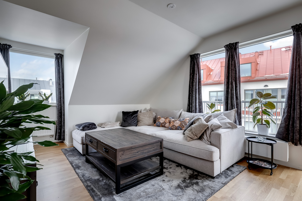 Modern och välplanerad trea på vindsvåning, högst upp i huset med ett fritt och vidsträckt läge över staden. Här bor du med ett generöst ljusinsläpp från flera väderstreck och en luftig känsla som förstärks av de lutande taken och de öppna sällskapsytorna.