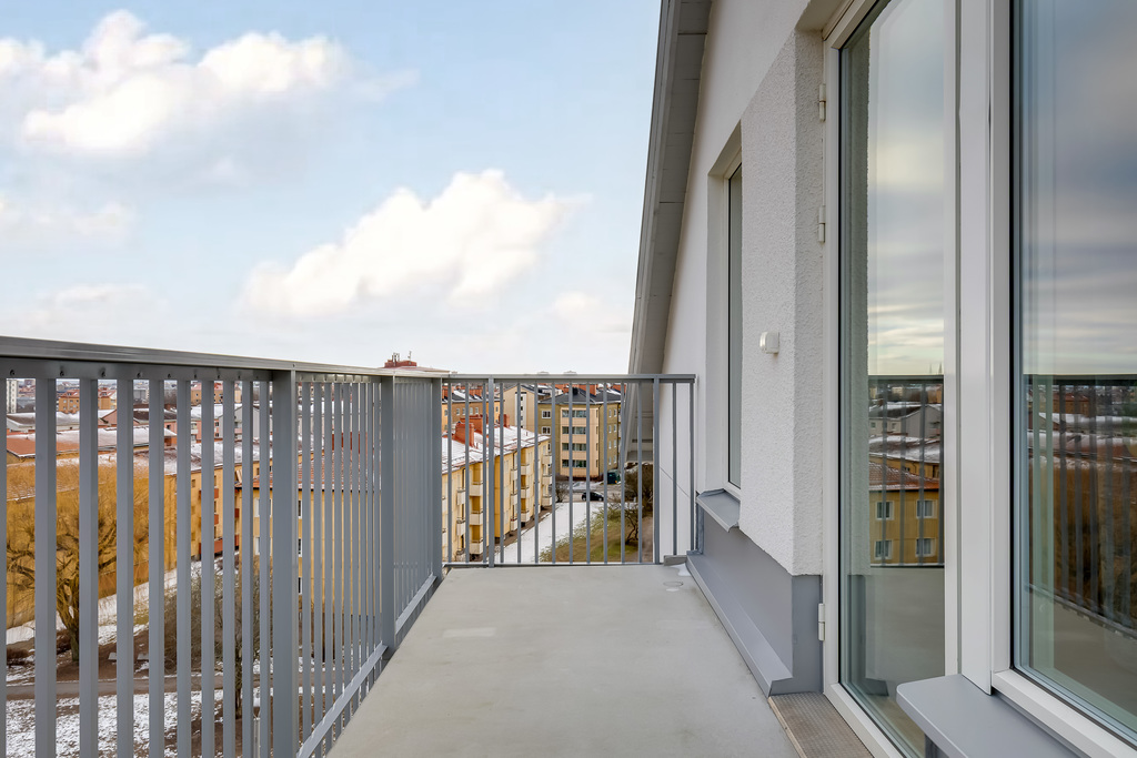 Den stora balkongen blir en naturlig förlängning av bostaden – en plats att njuta av utsikten över stadens takåsar och himlen ovanför. Vyn är närvarande även inifrån vardagsrummet, vilket skapar ett boende med både rymd och perspektiv.