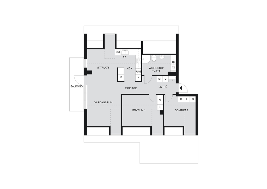 Kök, matplats och vardagsrum samspelar i en öppen och social planlösning med stilrena materialval och genomgående parkettgolv. Två sovrum samt ett helkaklat duschrum med tvättmaskin och torktumlare ger ett bekvämt och funktionellt boende.