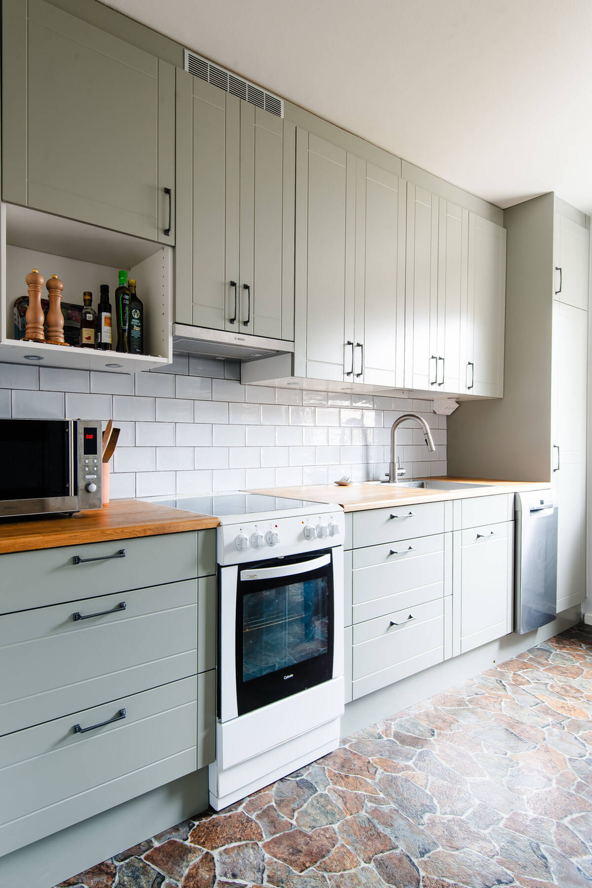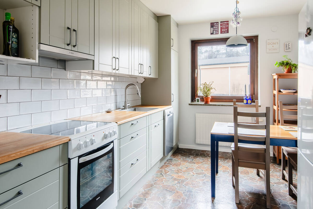 Nytt och fräscht kök med grönaluckor, svarta beslag, vitt kakel och bänkskiva i massiv ek. Infällda och diskreta spotlights i överskåpen. Spis med glaskeramikhäll, rostfri fläktkåpa och diskmaskin samt kyl/frys. Hål för inbyggd mikro finns. Gott om förvaring i lådor och skåp i ett kök där man tänkt till före. Matplats vid fönstret. På golvet ligger en plastmatta med stenimitation och väggar vitmålade.