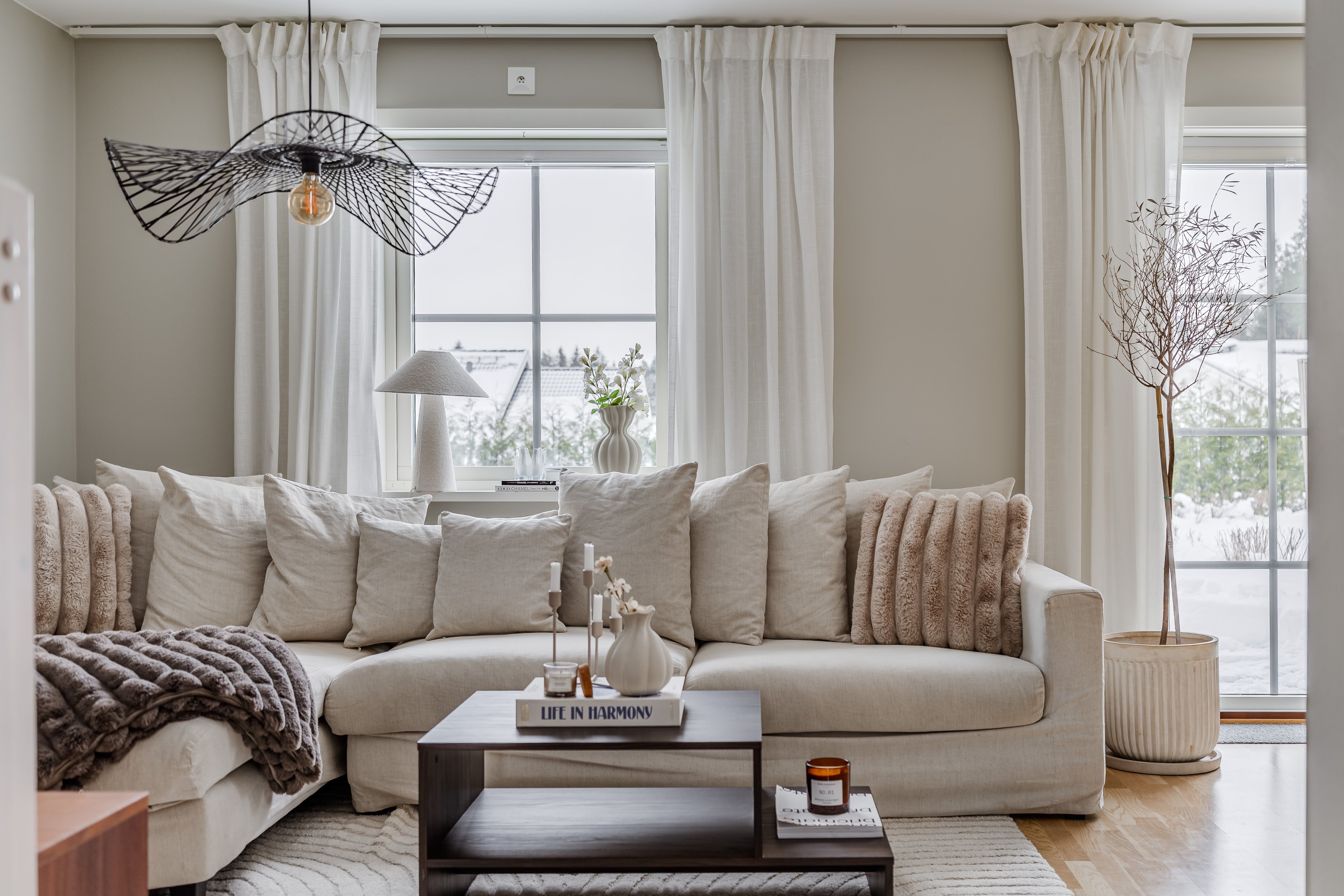 Ljus och stilren interiör med genomgående bra standard. Kök från Ballingslöv i öppen planlösning med vardagsrummet.