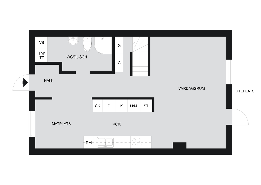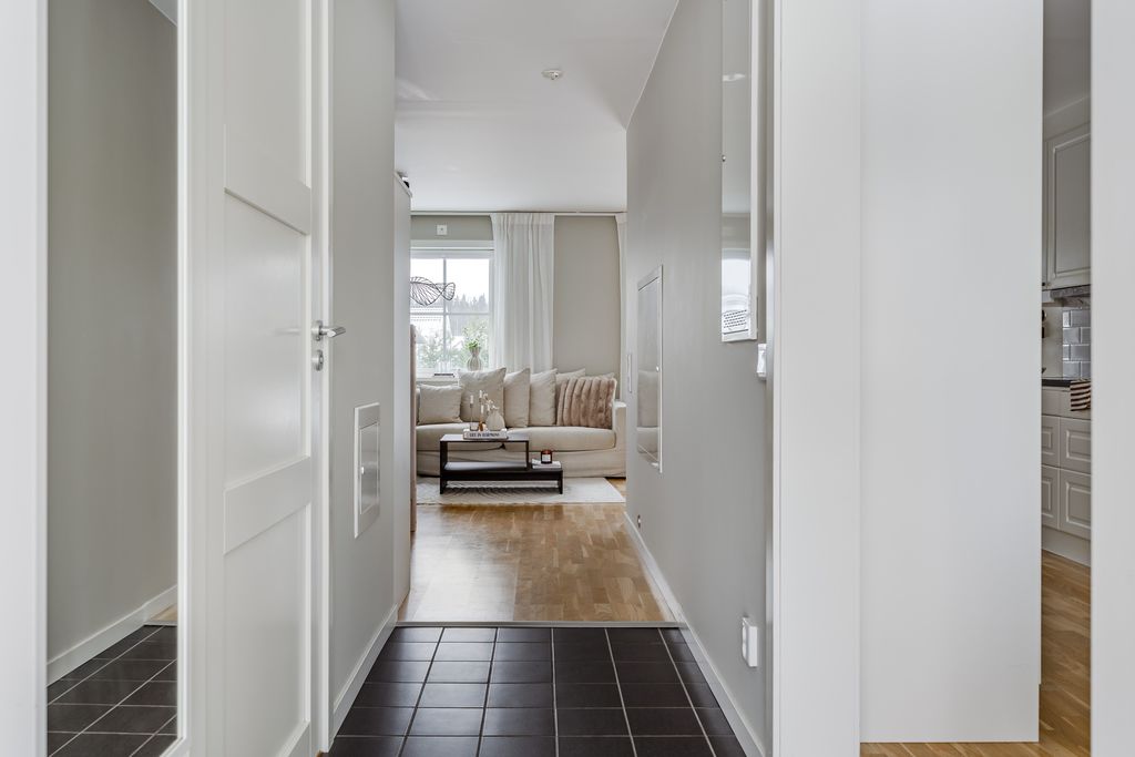 Hall med klinker i entrén och i övrigt parkettgolv i alla torrutrymmen (golvvärme i hela entréplan). Trappa till övre plan och garderober.