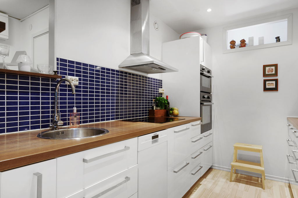 På vägen till vardagsrummet har vi nu köket som har delats av vid den tidigare matplatsen för att få till ett litet kontor eller barnrum mot byggnadens entrésida. Väggen kan enkelt plockas ner för den som vill återställa den ursprungliga planlösningen med en matplats vid fönstret istället. Köket har vita högblanka skåpsluckor och lådfronter samt två vitrinskåp på väggen. Den maskinella utrustningen består av en induktionshäll, kyl/frys, inbyggnadsugn och mikro samt en mindre diskmaskin. Ovan köksbänkarna sitter ett blått kakel som stänkskydd.