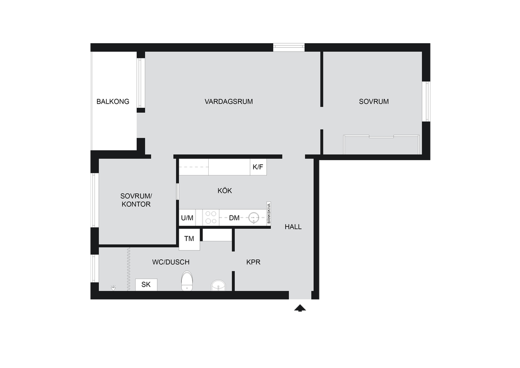 Bostaden fördelar sig på en delvis möblerbar hall, ett rymligt duschrum, kök samt vardagsrum med plats för både matbord och soffmys och med utgång till en insynsskyddad balkong. Vidare finns ett stort och ett litet sovrum/kontor att tillgå.