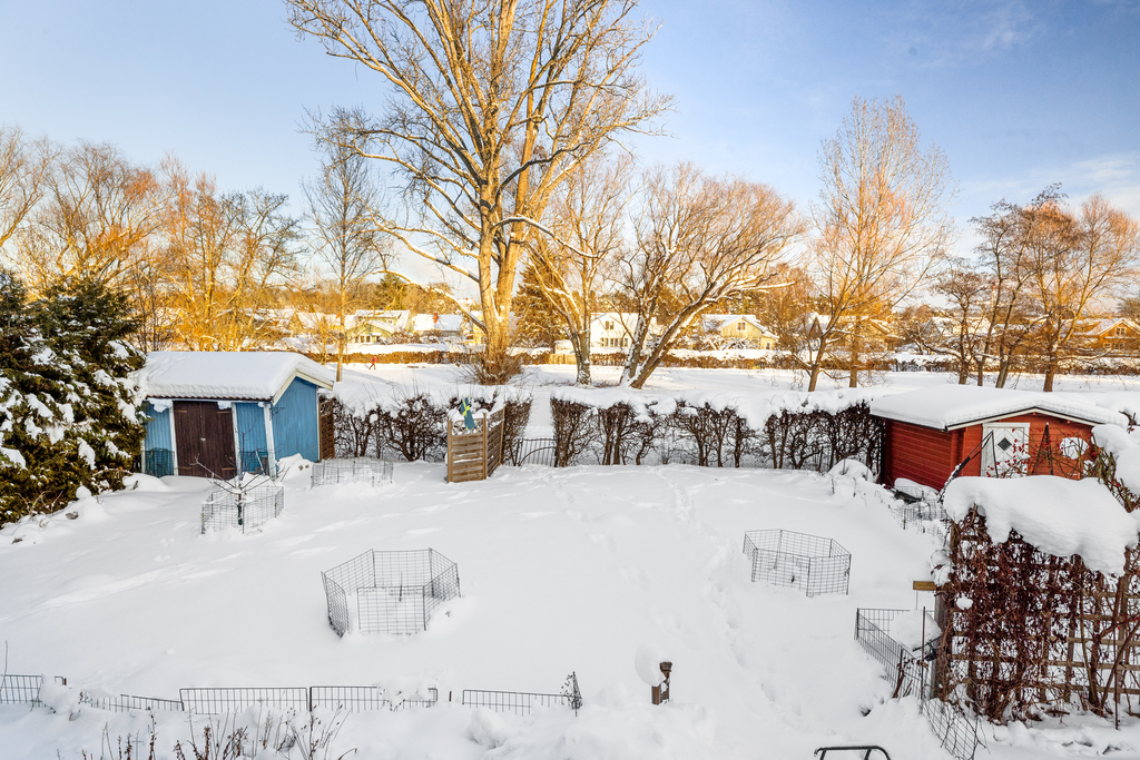 Det stora sovrummet fortsätter i samma stil – ljust, luftigt och med trägolv samt garderob. Härifrån blickar du ut mot den lummiga trädgården med insynsskyddat läge.