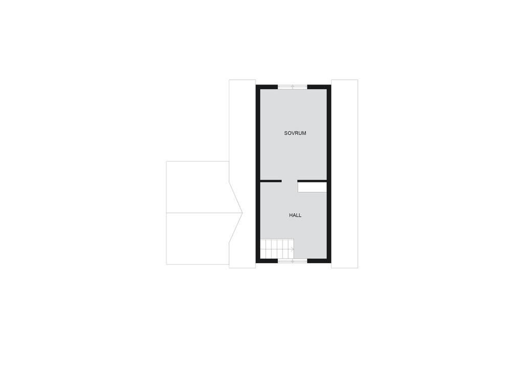 En trappa upp möts du av en ljus hall med trägolv och bra förvaringsmöjligheter. På detta plan finns också ett sovrum med snedtak och inbyggd förråd samt infällda hyllor – både charmigt och praktiskt.