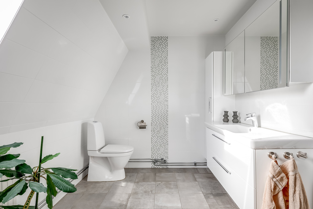 Klinkerplattor med värmeslinga, kaklade väggar samt vitmålat tak med spotlights. Wc, tvättställ i kommod, duschhörna med glasvägg, högskåp och handukstork.