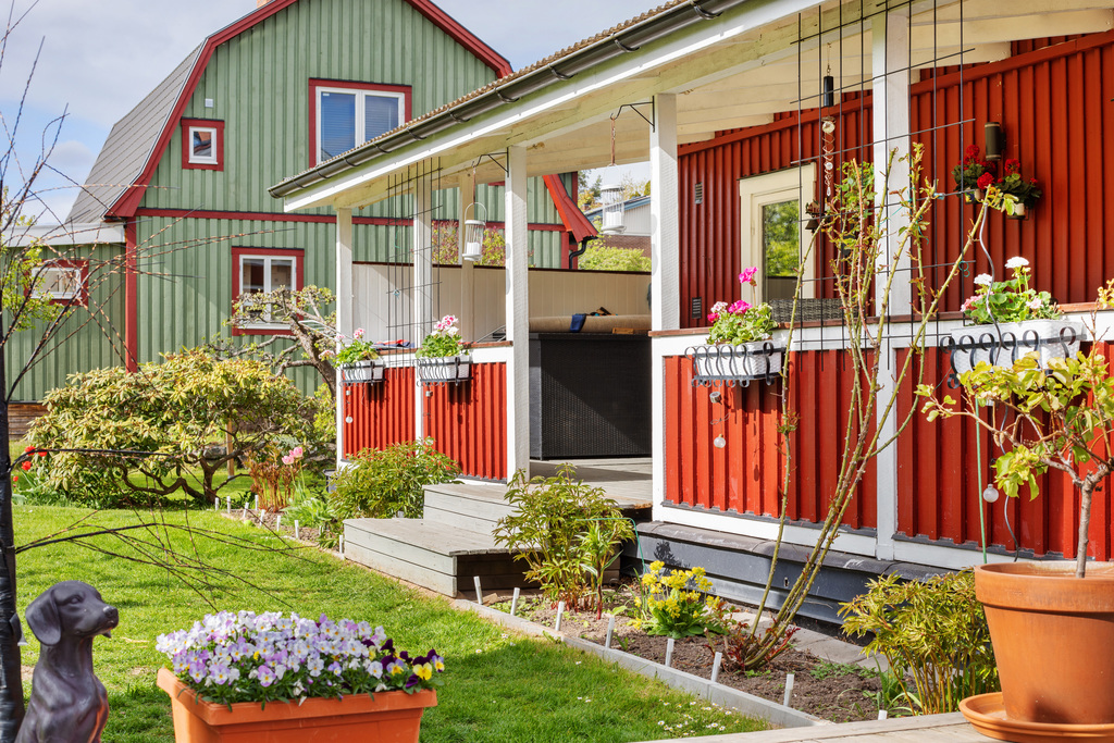 På övre plan finns tre fina sovrum med garderober, ett sällskapsrum och en mindre hall med utgång till balkong samt ett modernt duschrum med golvvärme som renoverades 2018.