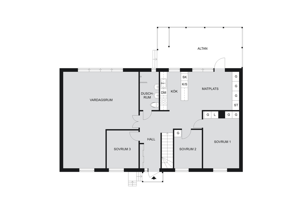 Husets hjärta är det stora vardagsrummet i vinkel, som med sina stora fönster öppnar upp mot trädgården och badar i naturligt ljus. Här finns gott om plats för socialt umgänge med både soffgrupp och matplats. Det rymliga köket har direkt anslutning till ett insynsskyddat altandäck, där du kan njuta av solens strålar större delen av dagen.
