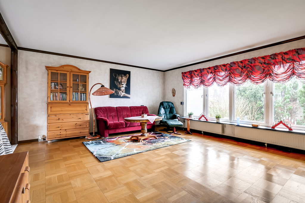 Pardörrar med glaspartier leder in till detta rum som går i vinkel med ekparkett på golvet och stora ljusinsläpp mot trädgården. Ovan fönstren finns en utvändig markis som är i dåligt skick. För den som behöver ytterligare ett sovrum finns möjlighet att dela av vinkeln där det finns ett fönster mot entrésidan.